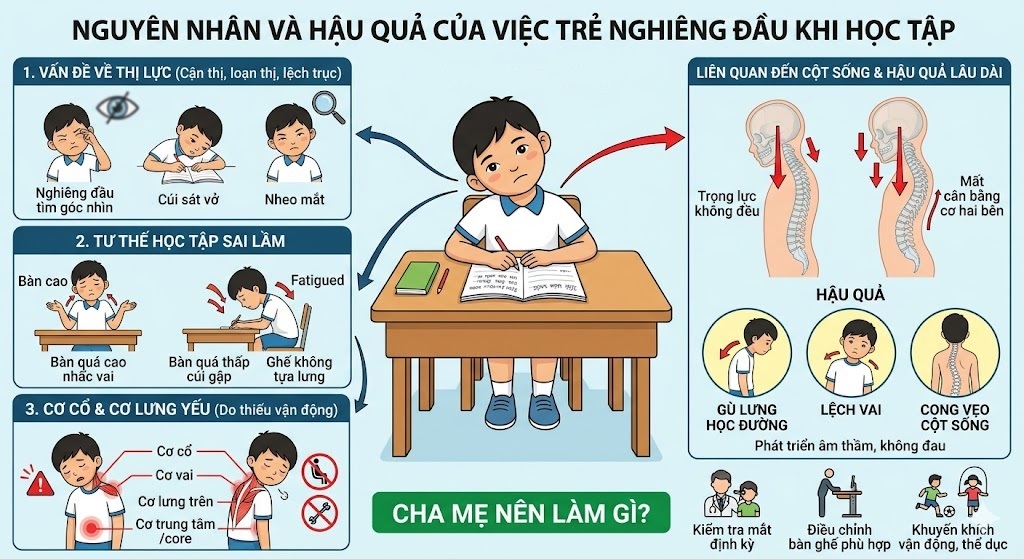 Trong quá trình học tập, nhiều phụ huynh dễ dàng nhận thấy một thói quen khá phổ biến ở trẻ: khi viết bài hoặc đọc sách, trẻ thường nghiêng đầu sang một bên. Thực tế, cơ thể trẻ nhỏ cực kỳ thông minh. Khi một bộ phận nào đó không thoải mái, não bộ sẽ tự động điều chỉnh tư thế để trẻ cảm thấy “dễ chịu” nhất trong ngắn hạn, dù tư thế đó có hại về lâu dài.Ban đầu, điều này có vẻ chỉ là một tư thế ngồi tạm thời hoặc thói quen nhỏ. Tuy nhiên, nếu hiện tượng này lặp lại thường xuyên, kéo dài nhiều tháng, thậm chí nhiều năm, thì đó có thể là dấu hiệu cảnh báo về tư thế, thị lực hoặc sự phát triển của cột sống.