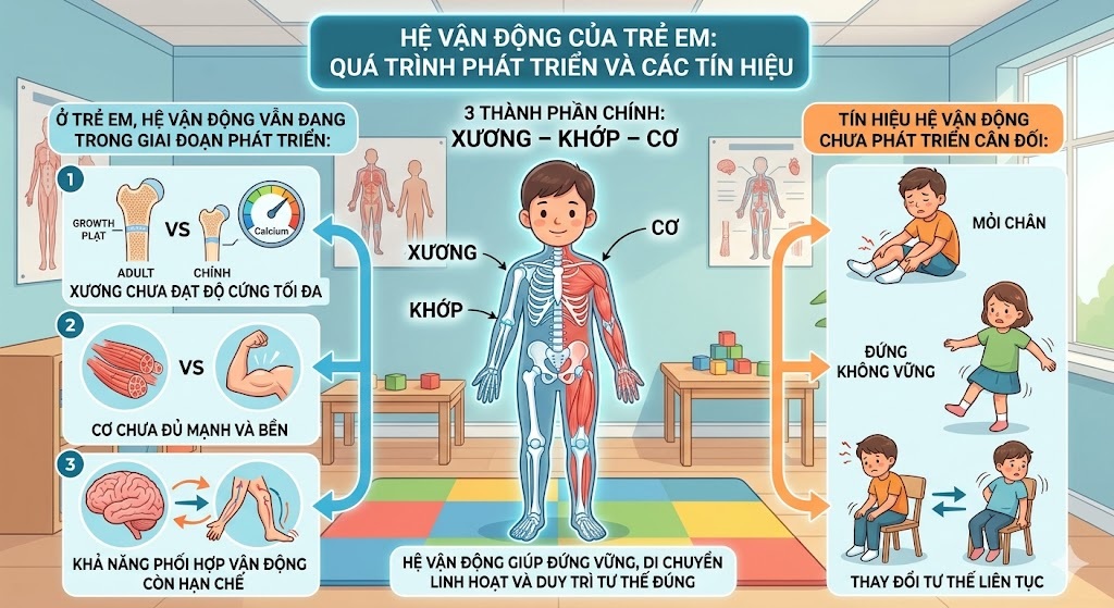 Ở trẻ em, hệ vận động vẫn đang trong giai đoạn phát triển: